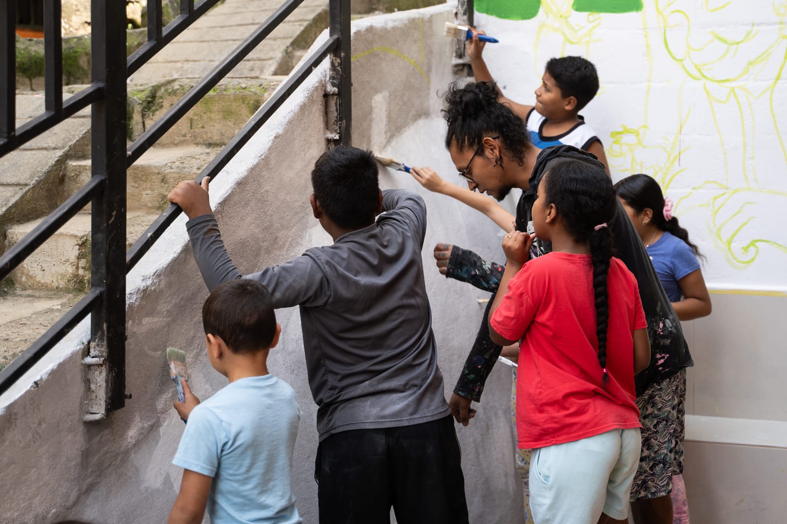 En el marco de la inauguración del Salón Juvenil de la Parroquia Santa María La Sierra, el arte urbano popular posibilitó un espacio abierto para que habitantes del barrio La Sierra y representantes de instituciones como Engim, UdeA (estudiantes de trabajo social), Huellas de Barrio, congregación Giuseppini di Murialdo, Mesa Juvenil La Sierra es Otro Cuento, Parque Biblioteca La Ladera; se reunieran en un espacio público para jugar, hacer manualidades, leer y escribir, pintar, estampar, diseñar y comer. Una toma cultural de encuentro intergeneracional posibilitó la reflexión del cuidado del barrio con apropiación de lo público como bien común.